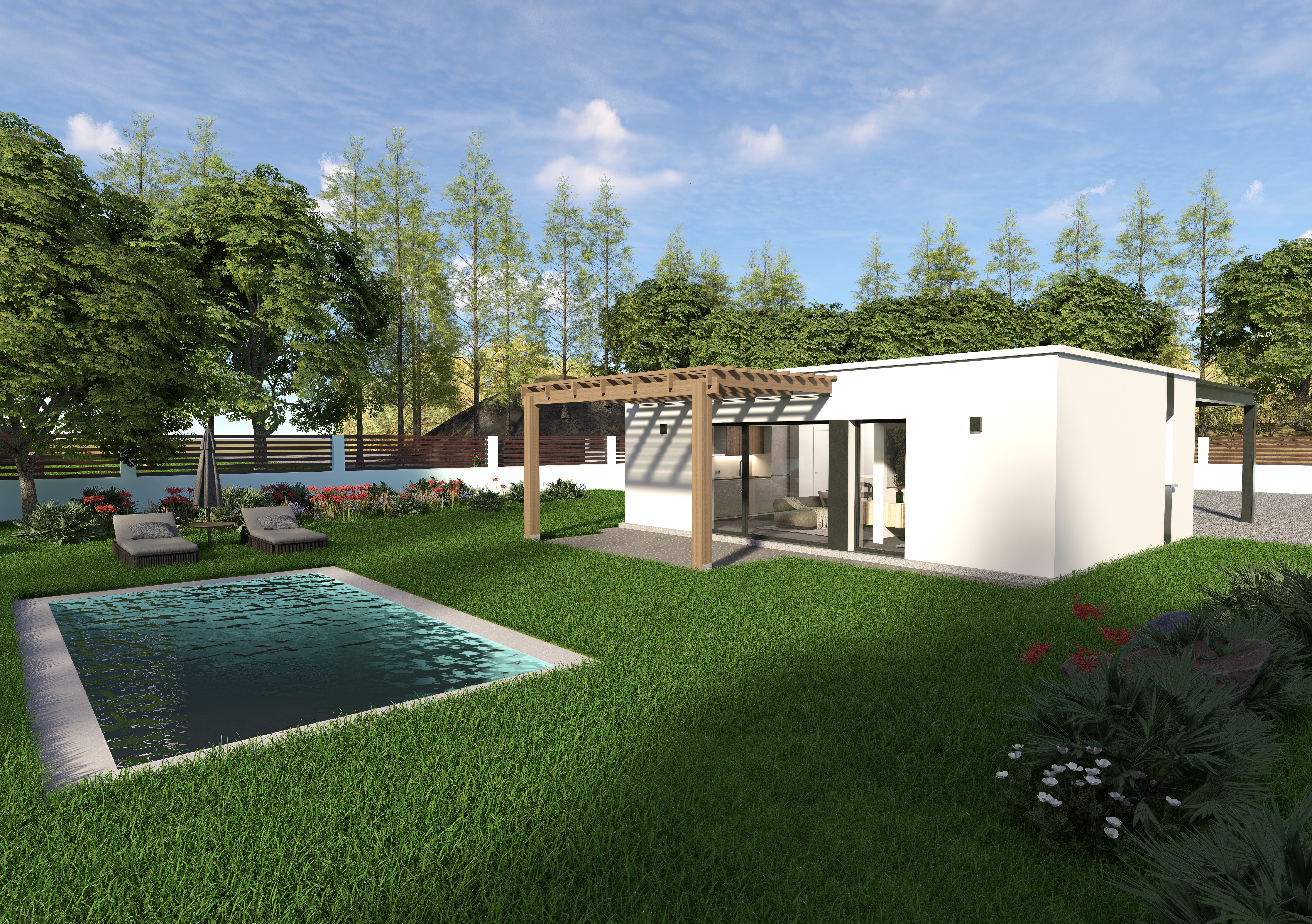 Los precios incluyen: Estructura y cubierta descritas, losa de compresión aislada, acabados de fachada, puertas y ventanas (persianas manuales en dormitorios), instalaciones, sistema aerotérmico para ACS, climatización, pintura interior y alicatados, baños y cocina.